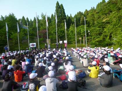 朝のつどいの様子です。たくさんの同宿校が一同に会し,朝のつどいを行いました。