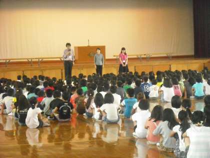 朝会では,7月からお世話になる理科の観察・実験アシスタントの先生と中学年の協力指導の先生の紹介がありました。