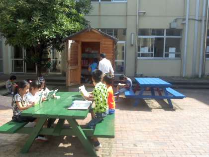京都新聞の情報ワイド面に掲載されている「母校の一番」という特集記事に本校の様子が紹介されることになりました。そのため,今日の中間休みに新聞記者の方が来校され,写真を撮ったり,インタビューをされたりしました。本校の「一番」は,中庭のログハウスの書庫と机椅子です。休み時間にお気に入りの本を読む児童の様子が記事や写真で掲載されると思います。