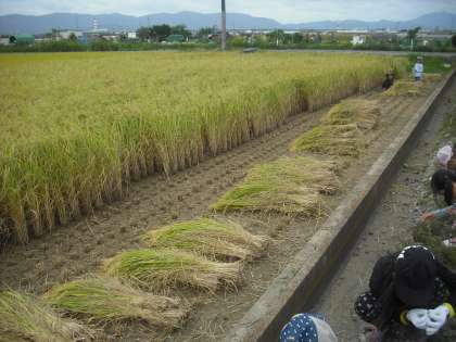 鎌を持つのが初めてで,最初は,苦労していた子もいましたが,慣れてくるとスムーズに刈り取ることができました。刈り取った束を6束紐でくくるのもたいへんな作業でした。