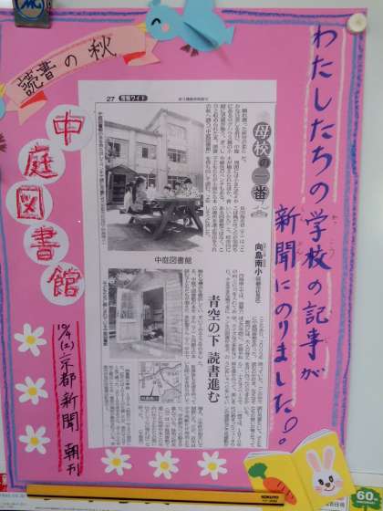 先日お知らせしたように10月4日付の京都新聞の朝刊に本校の中庭図書館の取組が紹介されました。多くの方が読まれたことと思います。学校の玄関に拡大して掲示してあります。