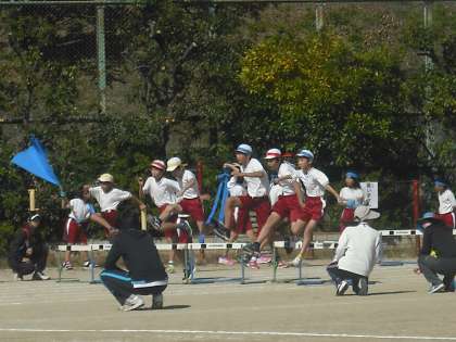 6年生のハードル走です。何度も経験してきているせいでしょうか。前傾姿勢で美しく跳べている児童もいます。さすが6年生,迫力があります。