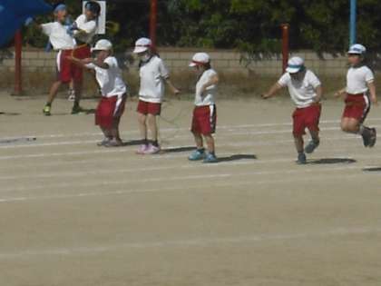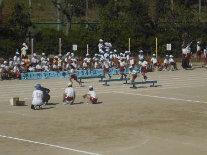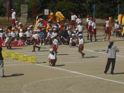 2年生の障害物競争です。最後のテニスラケットのボールを載せて運ぶのが難しそうです。