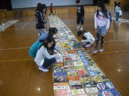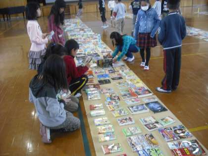 体育館で選書会がありました。子どもたちが本を手に取って,図書室に入れてほしい本を選びました。たくさん本がならべてあったので,どれを選ぼうか迷っている子もいました。