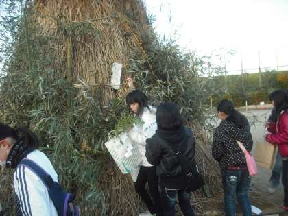 早朝にふれあいキッズの子がとんどのやぐらにお札や書初め,お正月の飾り物などをつけました。