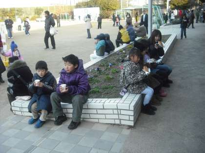 8時30分に模擬店が一斉に開店しました。どのブースも長蛇の列ができています。今年,野菜はたくさんあり運動場に出て売りさばく光景もみられました。