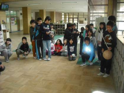 5年生の理科で,螺旋階段の上から縄跳びにくくりつけたボールを垂らし,左右に振って,波長や振幅を観察し,1周期にかかる時間を子どもたちが観察しました。子どもたちはとても興味深そうにボールが振れる様子を観察していました。
