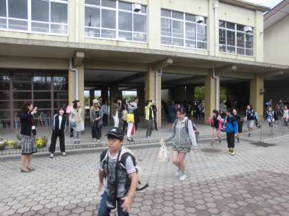 ピロティーで,司会の人が出発式を進め,誓いの言葉の中には「ルールを守ろう」「思い出をつくろう」など,最高学年らしい力強い言葉がありました。
