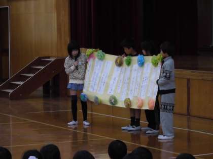 児童会の代表者が前に並んで、今年一年間の活動方針や内容を確認してくれました。また、各委員長の抱負もしっかりと力強く発表してくれました。