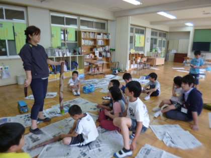 厚地先生が家の近所からの大きなたけのこを掘って持って来てくれました。たけのこを観察しながら墨や絵具やコンテで大きく絵を描きました。たけのこの中身を割って見たときには、全員が「おぉー!」と驚き、興味津々で見ていました。ろうかに掲示するので、ぜひ、ご覧ください。