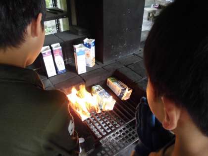 パンにキャベツとソーセージを挟んで,牛乳パックに入れて燃やすだけの簡単な料理ですが,焦がさないようにみんな丁寧にアルミホイルを巻いていました。