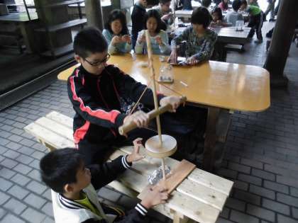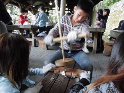 火おこしの道具をみんなで協力して扱いながら,次の活動のカレー作りで必要な火をおこしました。うまくいったグループや,頑張ったけど火がつかなかったグループがありましたが,ついたグループの火を分け合い,みんなそろって,次の野外炊事に挑みます。