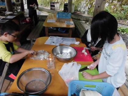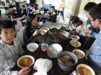 お米をといだり,野菜を切ったり,先ほどの火を使って窯に火をおこしたり…。力を合わせて一生懸命作ったカレーは,世界に一つだけのカレー。みんなでおいしくいただきました!