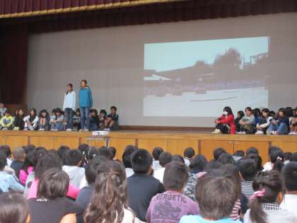 朝会で校長先生からは古典の日についてのお話がありました。そして転入生の紹介があった後,後半は向南タイム6年生の発表を行いました。