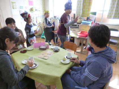12月14日,15日の昼休みに5・6組の教室をおしゃれに飾って,すくすくカフェをひらきました。前日の生活単元の授業でつくったさつまいもケーキをおすすめメニューに,飲み物も用意して学校の教職員の方々を招待しました。注文を聞く人,ケーキを運ぶ人などグループで役割分担をして,自分の役割をしっかりとがんばることができました。
