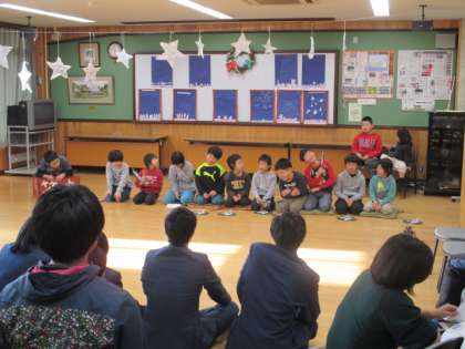 19日(月)に,向島中学校にてクリスマス会をしました。中学生による素敵なハンドベル演奏のオープニングからはじまり,それぞれの学校で出し物をしたり,中学生に教えてもらいながらミサンガ作りをしたりと楽しい時間を過ごしました。向島南の出し物はもちろん大喜利!学習発表会以来のお客さんへの披露でしたが,たくさんの人に笑ってもらうことができ大成功しました。