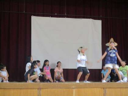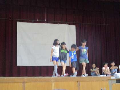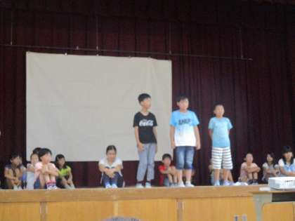3泊4日で学んだことを全校の前で発表しました。言葉や歌,寸劇など,色々と工夫して発表することができました。終わった後の子どもたちの表情を見てみると,達成感に満ちた表情でした。
