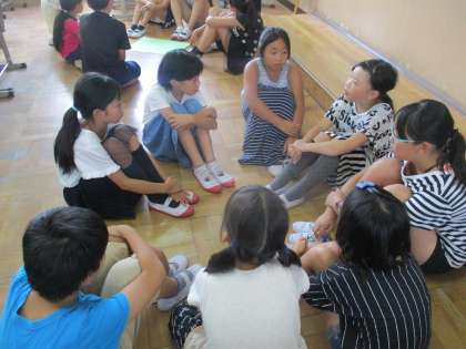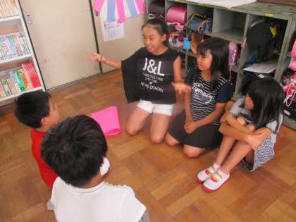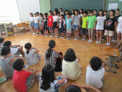 長期宿泊で学んだことを4年生に伝える会をしました。4年生も来週,宿泊活動に行きます。そこで,5年生が先輩として,係に分かれて質問に答えたり,スタンツを紹介したりしました。子どもたちは,4年生に分かるように,優しくかかわることができました。