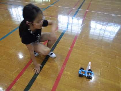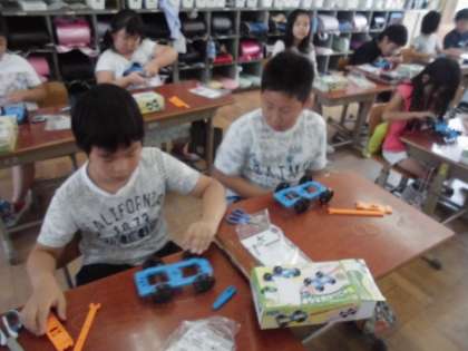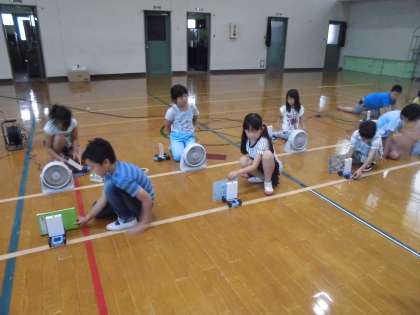 風の力やゴムの力を使って車を走らせました。おもった以上に車が動いて,子どもたちも驚きながら学習を進めていました。