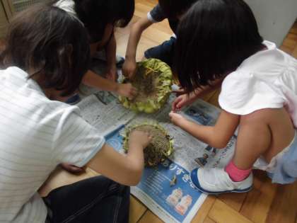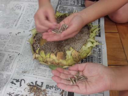 花が枯れてしばらく経ち,子どもたちの楽しみにしていた種ができました。花の後に種ができるということは,朝顔の観察を通して知っていた子どもたち。しかし,実際にひまわりの花にできた種を目にすると,「えーっ,こんなにいっぱいできるの?」「何個あるんだろう」と目を丸くしていました。