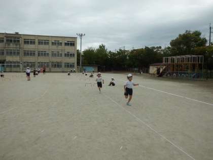 運動会に向けて,ミニハードル走を練習しています。ハードルを並べたり,自分たちでタイムを計ったり役割を決めて学習を進めていきます。ハードルがないときのタイムに近づけるよう跳びかたを工夫していきます。