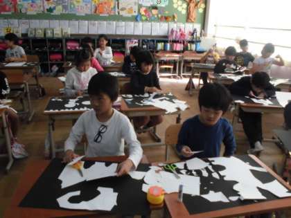 図工の学習では,はさみで紙をチョキチョキと自由に切っていき,切った紙から何が見えてくるかを考える「はさみのアート」を行いました。