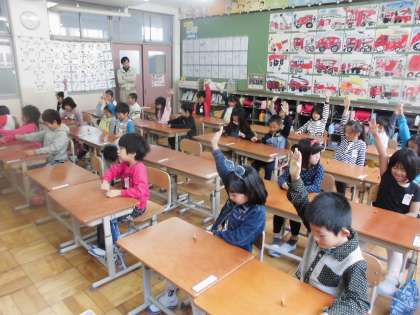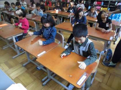 「勢いよくまわすといいよ」「はやくまわすといいよ」と,みんなで教え合いながらこま回しをしました。最後は,クラスみんなでこま回し対決をして楽しみました。