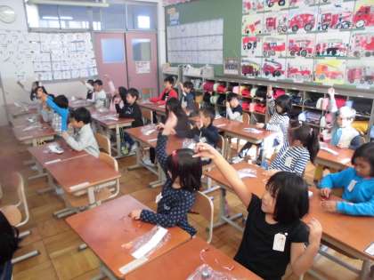 こまより材料も多く,作るのが難しい部分もありましたが,どの子も話をよく聞いて,一生懸命作っていました。1年生の子たちにとっては,針金を曲げるのが一番難しかったようですが,その中でも「どんな形にしたらおもしろいかな」「くるんと一周まわしてみようかな」などと,楽しそうに考える姿が見られました。