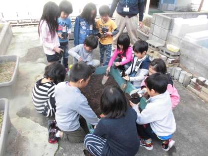 1年生の子たちは,小学校に入学してから半年の間に,アサガオやヒマワリ,きゅうりやえだまめなど,たくさんの花や野菜を育ててきました。それもあって,植物を育てることが大好き!新しくデイジーを植えると知ると,「やったぁ!」と嬉しそうな声が上がりました。