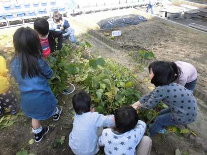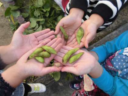 その後,枝豆の収穫をしました。雨が続き,なかなか収穫できずにいた枝豆。雨のおかげで,一粒一粒が大きく立派に育っていました。袋いっぱいに集まった枝豆を見て,「みんなで食べたい!」と,嬉しそうな子どもたちでした。