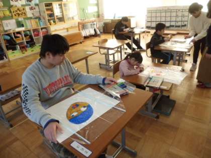 凧揚げをしました。風にも恵まれ,予想よりもうまく飛ばすことができ,子どもたちも大喜びでした。寒さを忘れ,元気に運動場をかけ回りました。教室でも,こま回しや福笑いなど,お正月の遊びが流行っています。