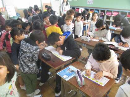 1年生が学校探検をしていて,6年生のがんばっている学習の様子を見に来てくれました。6年生も気が引き締まり,とても集中して取り組めていました。