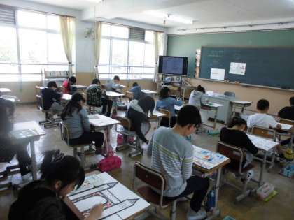 その後,自分の行ってみたい街並み,世界を思い浮かべ,色や形の組み合わせを楽しみながら絵を描きました。描き始めると,どの子も真剣!しんと静まり返った教室で,思い思いに自分の世界を描いていました。
