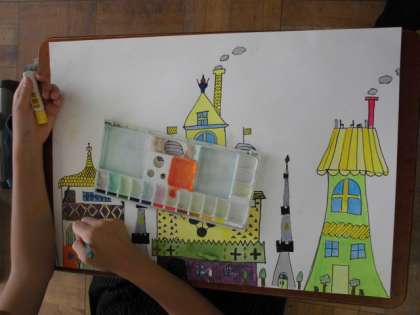 色をつけ,町並みがカラフルになるにつれ,「○○さんの町,すてき!行ってみたいなぁ」といった声も聞かれるようになってきました。完成が近づくにつれ,絵の具だけでなくコンテや黒ペンなど,画材を選ぶ姿が見られるようになってきました。「優しい雰囲気にしたいから,コンテで色をつけよう」「はっきりさせたいから,黒ペンでかき足そう」などと,「自分の表したいかんじ」を大切にする姿が素晴らしいです。