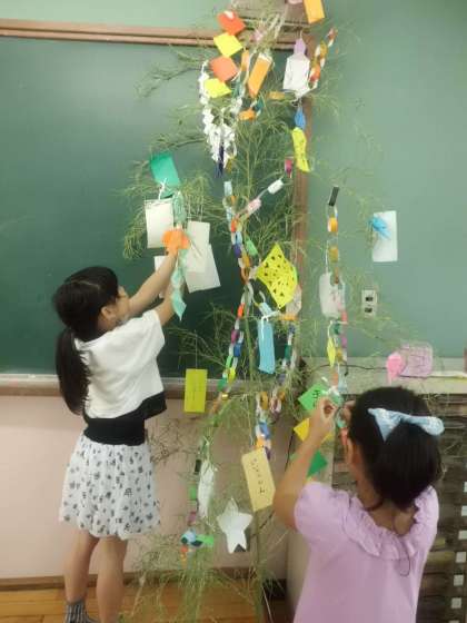 放課後まなび教室の時間に,七夕の飾り作りをしました。一人ひとりの思いのこもった飾りを笹に付け,素敵な笹飾りができました。七夕が待ち遠しいです。みんなの願い,届くといいな。