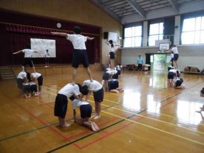 1人技から始まった練習も,2人,3人と少しずつ人数が増え,今週は5人技や6人技に取り組んでいます。人数が増えるにつれ,タイミングを合わせるのも難しくなります。しかし,技の難易度があがるにつれ,「1,2,3,4・・・」と自分たちでカウントをとったり,ポジションを変えて安定する組み方をさがしたりしながら,進んで練習に取り組む姿が見られるようになってきました。