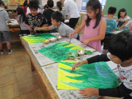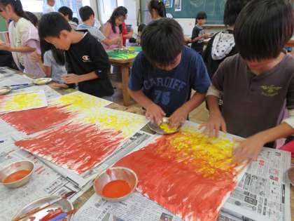 運動会を終えて、学習発表会に向けての取組みが始まりました。今日は図工の学習で習ったスタンピングの技術を使い、向島の田畑やツバメのねぐらを描きました。