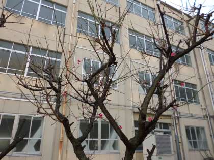 学校の中庭に梅の木があります。その梅の木にかわいい花が咲きました。