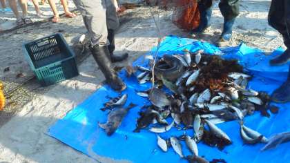 重い網をみんなで力を合わせて引き上げると、たくさんの魚が!