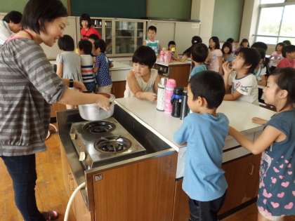 コーンがはじけて,おなべから「ポン!ポン!」と音が鳴り出すと,子ども達は大喜び。おなべいっぱいに増えた,ポップコーンを見て,子ども達は目をまん丸にして驚いていました。