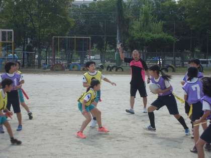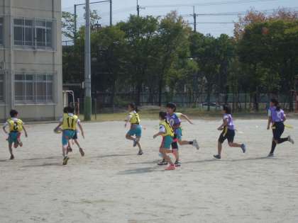 今日は,洛央小学校のチームを招いてのタグラグビー交流試合でした。