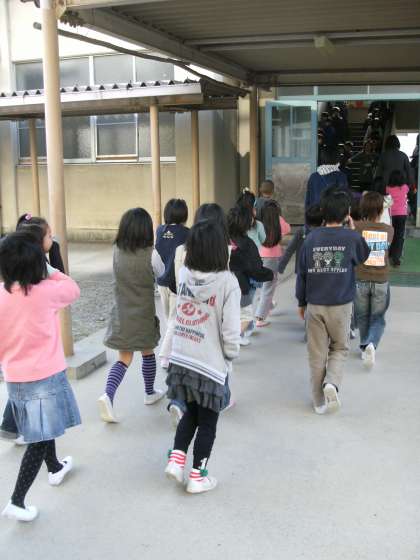地震が起こり,さらに家庭科室から出火したという想定で避難訓練を行いました。