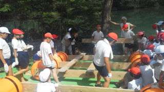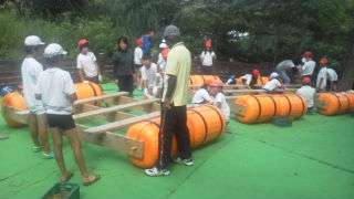 作り方はシンプル。でも,ちょっとしたことでもチームでの協力が不可欠。子どもたちは「こっち持つよ」「後ろ気をつけて」「ありがとう」と気持ちのよい声をお互いでかけ合いながら,いかだを作りあげました。
