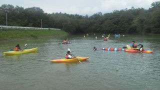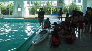 全員でカッター,グルーブでいかだ,そして最後は一人でカヌーに乗ります。そのために,まずはプールで練習をします。ひっくり返ったらどうする等,大切なことを学び,その後,外に出てカヌーで楽しみました。