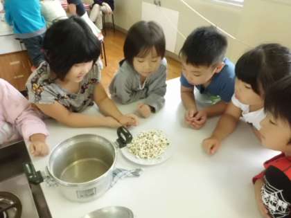 鍋の中でぱちぱちとはじける音を,耳を澄まして聞いている子どもたち。