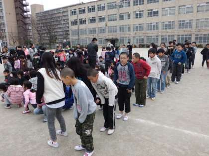 緊急地震速報がなり,まずは身を守るための一次避難,それから運動場に二次避難をする訓練を行いました。