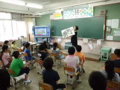 いつもと違う先生に本を読んでもらっています。