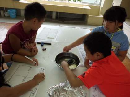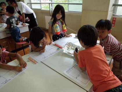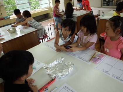 ナスの特徴を手,耳,目,におい,味の五感を使って調べます。