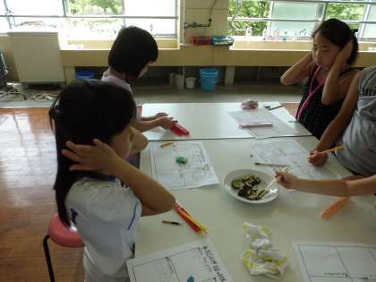 生活科ですくすく畑で育てたなすびを使って,いろいろな発見をしました。子どもたちはなすびを実際にさわったり,においをかいだり,切ったり,油でいためたものを味わったりしました。これまであまり食べられなかったなすびが食べられるようになったという児童もいて,楽しい時間を過ごしたようです。