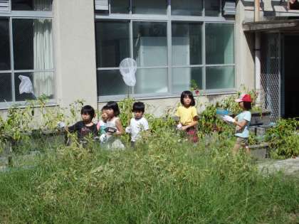 生活科の活動で校内の虫を探しに出かけました。子どもたちは虫取り網を使うのが上手です。たくさんのトンボやバッタ,コオロギもつかまえました。どんな形をして,どんな色をしているのかよ〜く観察していきます。